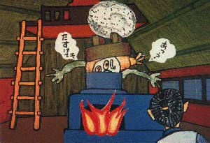 かまが熱んなって来たけん「助けてごせ、熱(あ)つていけんわあ」てってさわぐげな。定兵衛さんが「なんが助けてやあだら、おらのサバ取って食ったり、人を困らせてばっかりおおけん、今夜は焼き殺いちゃあ」「もうしやあせんけん、助けてごせ、助けてごせ」っていうやつを、どんどん火をたいて、とうとう焼きころいてしまったと、